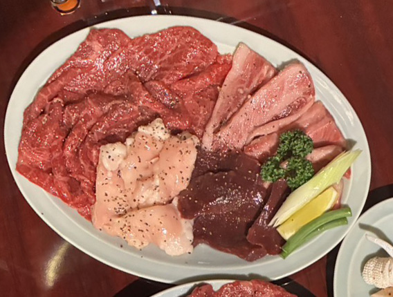 カルビ、ロースの2種類と上ミノやハツなどホルモンを2種類盛り合わせた約250g。